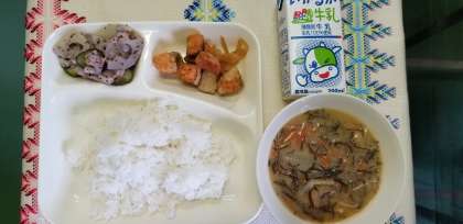 本日の献立は、小学生が、寒い冬にからだがあたたまり、海草や野菜をおいしくたくさんとれるようにした、学校給食献立コンクール優秀賞作品です。鮭の南蛮漬け、もずくのおみそ汁、れんこんの赤じそあえ、ごはん、牛乳です。