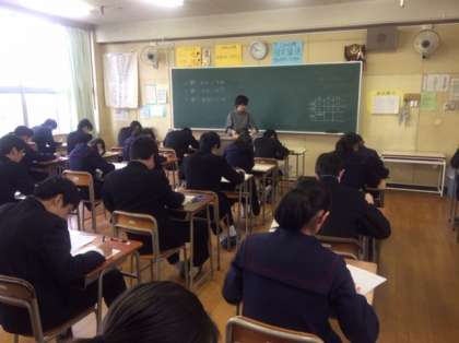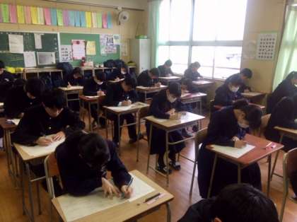 1月25日、3年学年末テストの最終日です。今日は数学・英語・音楽のテストです。最後の最後まで頑張りましょう。