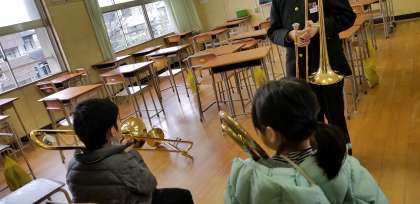本日、ベアーズ吹奏楽部がありました。もうひととおりの楽器を体験した児童もいるようです。