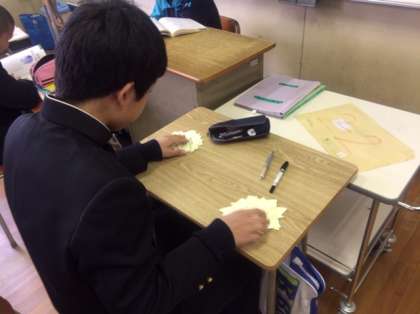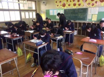 1時間目、2年生は3年生に送るメッセージを作成しています。1・2組の様子です。
