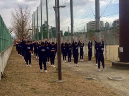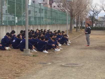 本日3時間目、真田山公園杯3年の部が始まりました。まずは1・2組です。準備運動の後、諸注意がありました。いよいよスタートです。