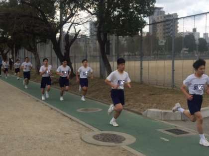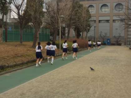 3組担任の高谷先生も特別参加して力走しています。鳩も横から応援しているぞ〜。3組のみんな、担任の先生には負けるな〜。