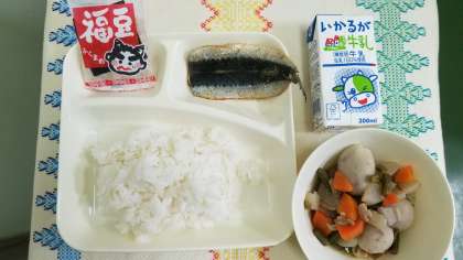 本日は、節分の行事献立です。いわしの生姜醤油かけ、含め煮、いり大豆、ごはん、牛乳です。