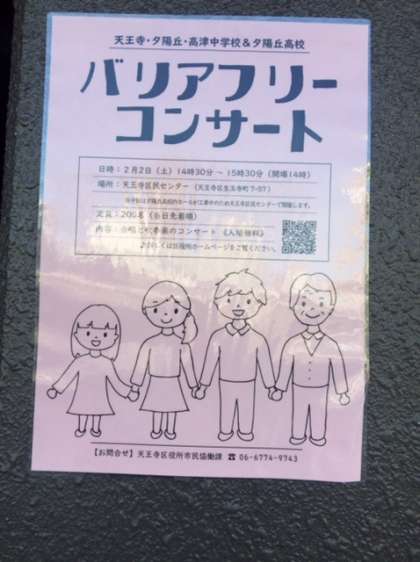 本日14時30分より天王寺区民センターにおいて、バリアフリーコンサートが行われました。天王寺区内3中学校と夕陽丘高等学校との合同コンサートです。