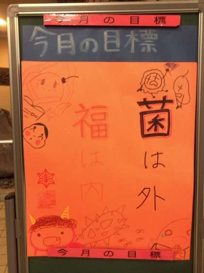 2月の学校目標が玄関ピロティに掲示されています。「菌は外 福は内」です。インフルエンザなどの菌を追い出して、学年末テストや行事、入試などで福を呼び込もう!という意味で決まったそうです。