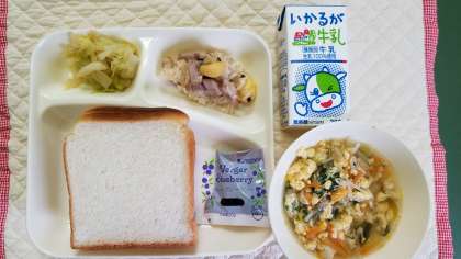 本日の献立は、中華おこわ、卵スープ、キャベツのオイスターソースいため、食パン、牛乳です。