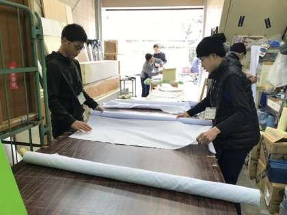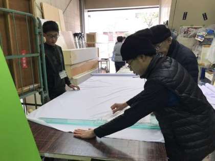 本日より二日間、2年生は職場体験学習を行っています。随時、巡回して体験の様子を紹介していきます。まずは学校の前の「クリエイト坂本」です。イベントで使用するテーブルクロスを裁断しているようです。「社長!」と声をかけながら頑張っています。