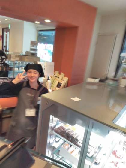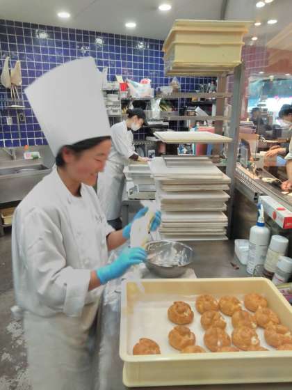 「ル・ピノー 玉造支店」の様子です。店頭の係と商品作りの係に分かれています。2人ともユニホームが似合っていますね〜。