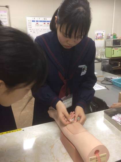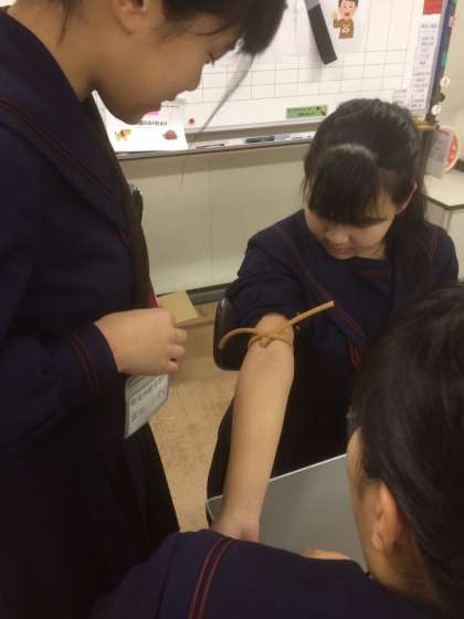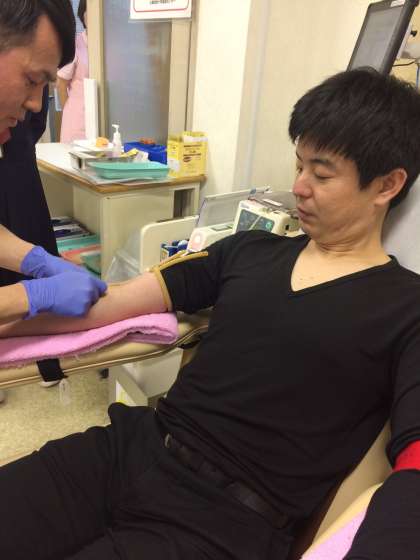「大阪府赤十字血液センター」の様子です。採血の方法を教えてもらっています。巡回の山田先生が実際に献血しました。もちろん採血したのはセンターの方ですよ。