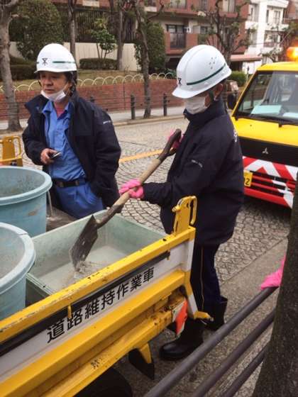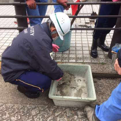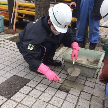 「大阪市建設局田島公営所」の様子です。真田山公園前の坂道タイルの補修をしています。古いタイルをツルハシで剥がし、セメントを作って埋めています。