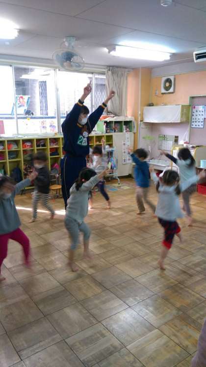 「味原保育所」の様子です。散歩に連れて行ったり、ままごとしたり、キリンさんになって踊ったりと大変ですね〜。