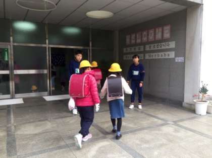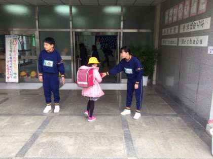 「味原小学校」の様子です。登校指導では必ず児童と手でタッチします。いろいろと忙しかったと思います。