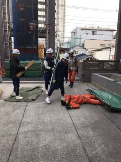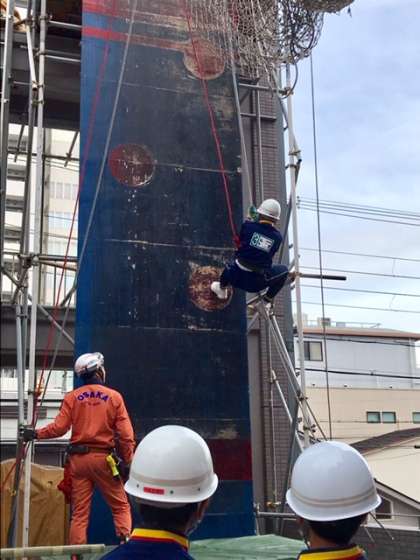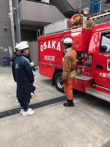 「天王寺消防署」の様子です。救助活動訓練をしています。手の力だけでのロープ登りの体験や4トン以上の重さをあげることができる機材を使わせていただいたり、実際の救助活動などをさせてもらったりしました。きつそうですね〜。