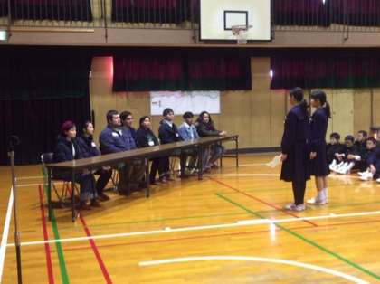 代表生徒、歓迎のあいさつがありました。日本語と英語でのあいさつです。その後、8人の留学生が一人一人自己紹介をしてくれました。みなさん、日本語が上手ですね〜。