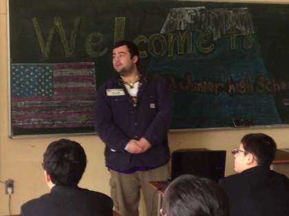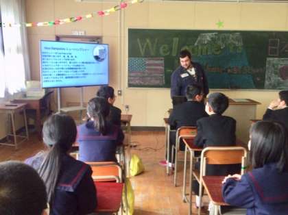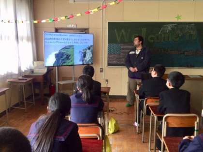 数学教室ではアメリカ出身のニックさんです。大きな人ですね〜。ゆっくりと母国の紹介をしてくれました。担当は2組のグループです。