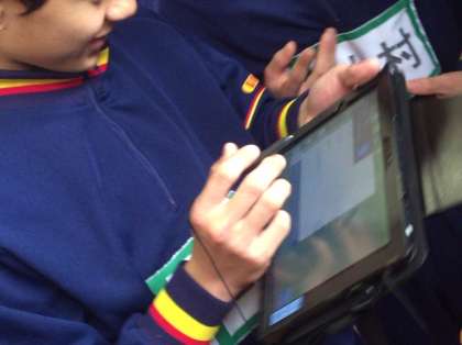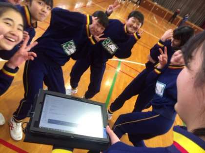2年体育の授業の様子です。ダンスを行っています。グループごとにタブレットを活用しながら練習しています。タブレットを使っているところを撮影しようとしたら、群がってきました。