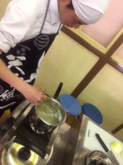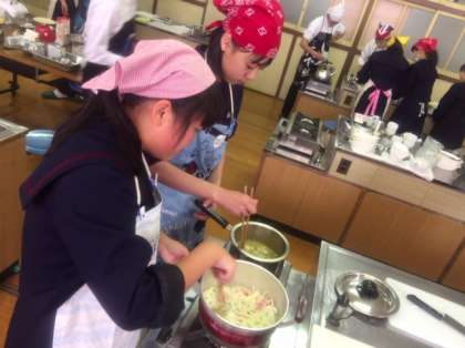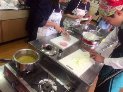 玉ねぎ・ハムを結構上手に切っていました。ホワイトソースは焦がさないようにしましょう。
