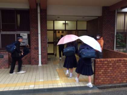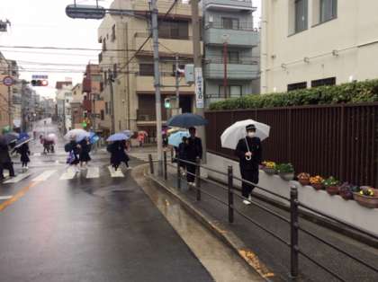 2月19日、朝から冷たい雨が降っています。傘の花が咲く登校風景になりました。