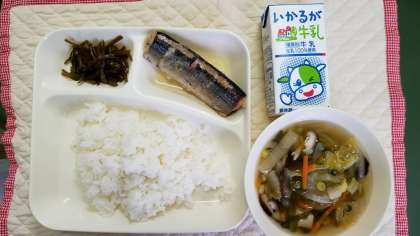 本日の献立は、さんまのみぞれかけ、すまし汁、茎わかめのつくだ煮、ごはん、牛乳です。