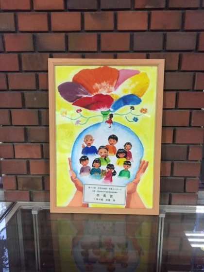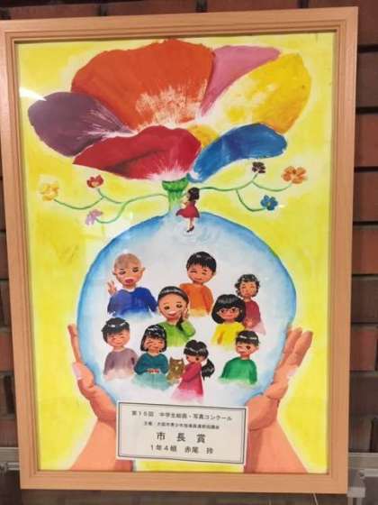 大阪市青少年指導員連絡協議会主催の第15回中学生絵画・写真コンクールにおいて1年4組の赤尾玲さんの作品が「市長賞」を獲得しました。全校集会でも賞状伝達を行いましたが、その作品を玄関ピロティに展示しています。赤尾さんに話を聞きました。テーマは「幸せのかたち」だそうです。災害などの時には水は欠かせない大切なもの。その大切なものの中で色々な人の幸せそうな笑顔がある。そして、色鮮やかな花を咲かせ、幸せが広がっていくとイメージだそうです。色々な人の表情を描くのに苦労したと言ってました。本当に素晴らしい作品ですね〜。みなさんも作品に手を触れずに鑑賞していただきたいと思います。