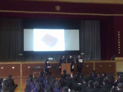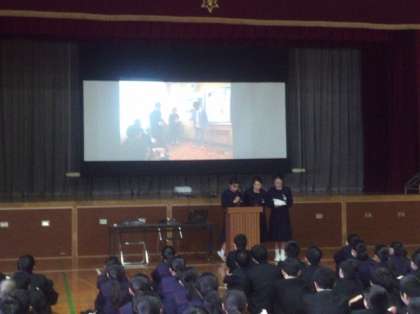 6時間目、1年生は体育館で国際交流の発表会を行いました。2月8日に行った国際交流のまとめです。