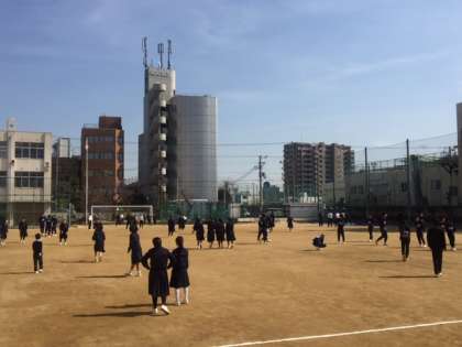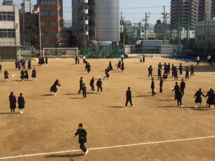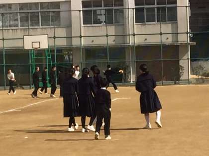 昼休み、グラウンドに出たら、暖かかったですね〜。15度あります。たくさんの生徒がボールなどで遊んでいます。グラウンドが狭いので人口密度が非常に高いです。