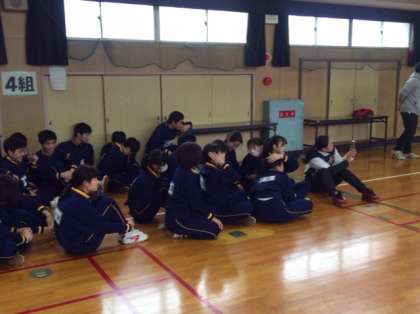 第2ゲーム「靴飛ばし」いっせ〜の〜での合図で片方の体育館シューズを飛ばす。遠く飛んだら勝ち。あらあら、飛ばす時に後ろに靴が脱げた人がいました。マイナスやがな。