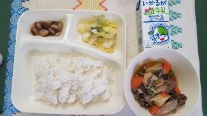 本日の献立は、肉じゃが、白菜のゆず風味、とら豆の煮もの、ごはん、牛乳です。