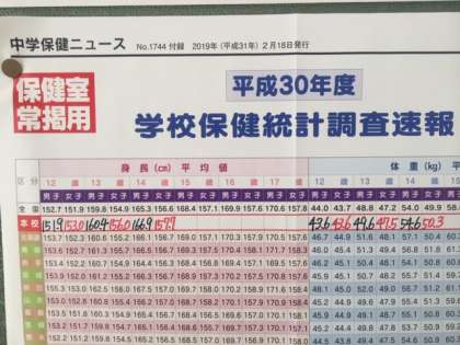 保健室前の掲示版に平成30年度学校保健統計調査速報が貼り出されています。本校の体格は1年生男子以外、だいたい全国平均よりも大きいですね〜。