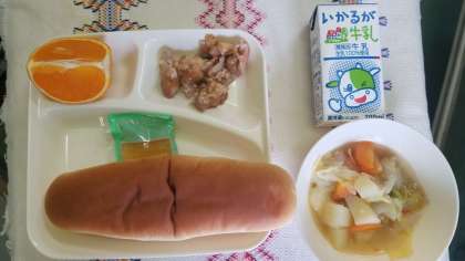 本日の献立は、鶏肉のみそバターソース、スープ煮、デコポン、コッペパン、牛乳です。