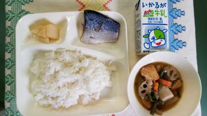本日の献立は、さばの塩焼き、厚揚げと里芋の煮もの、だいこんのみそ煮、ごはん、牛乳です。