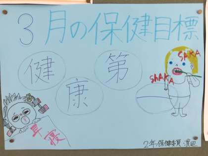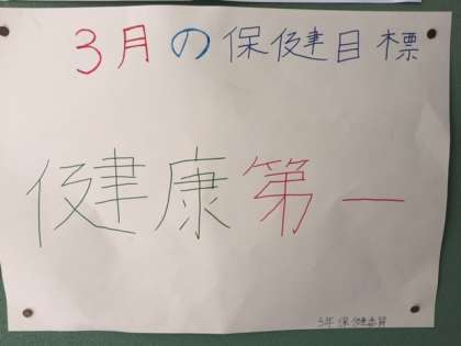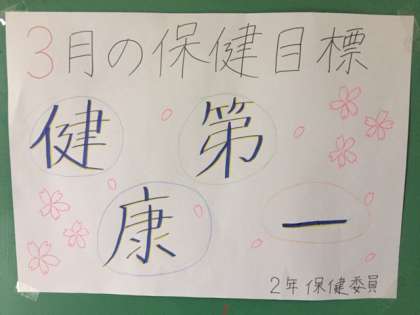 保健室前や各階の掲示版に3月の保健目標が掲示されています。「健康第一」です。当たり前のようですが、今一度、健康に留意しましょう。