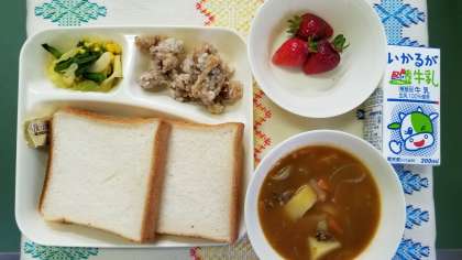 本日は、卒業お祝い献立です。フライドチキン、カレーシチュー、春のカラフルソテー、イチゴ3つ、食パン、牛乳です。