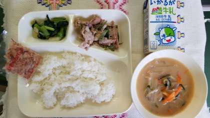 本日は、豚肉のごまだれ焼き、みそ汁、小松菜のおひたし、ごはん、牛乳です。