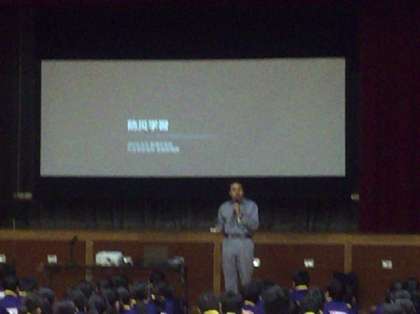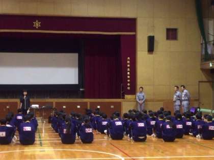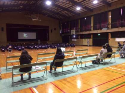 体育館では区役所危機管理課の方による講話です。過去にあった大震災の映像なども見ました。