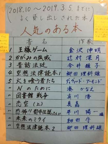 図書室の前に昨年10月から貸し出された図書のランキングが掲示されています。ビブリオバトルで学年代表になった本も入っていますね〜。