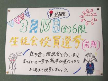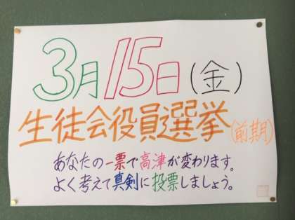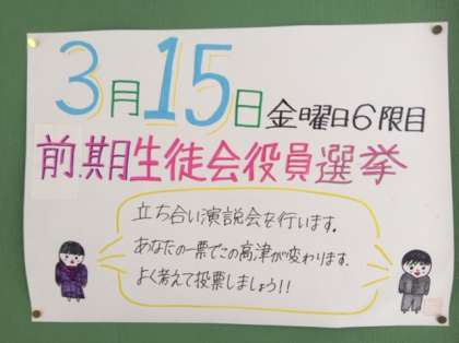 1・2年の廊下に3月15日に行われる生徒会役員選挙のポスターが掲示されています。今回の選挙は多くの立候補者がいます。