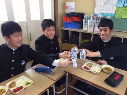 最後だぜ!牛乳でカンパ〜イ!楽しく食べています。