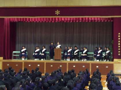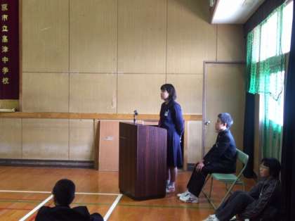 本日6時間目、前期生徒会役員選挙立会演説会を行いました。選挙管理委員会の進行のもと諸注意があり、演説が始まりました。写真下は会長候補の一人です。