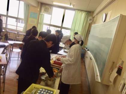 2年生の様子です。おかわりの行列が出来ています。楽しそうに食べています。