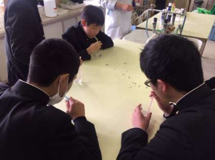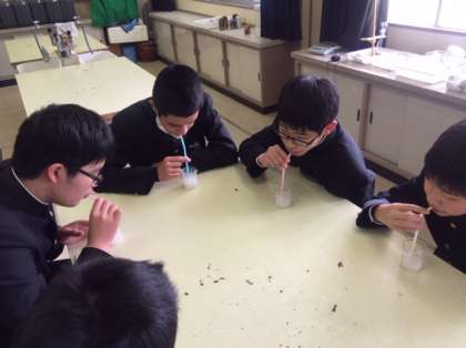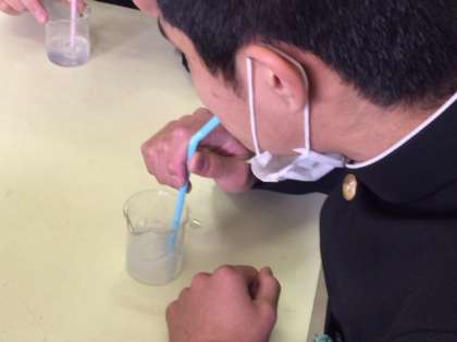 科学部が実験をしていました。石灰水にストローで息を吹き込むと白く濁ります。つまり二酸化炭素と反応したということです。さらに二酸化炭素を吹き込み続けると透明に戻るそうです。皆さん、透明になるまで吹き続けています。根気のいる実験ですねぇ。