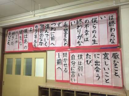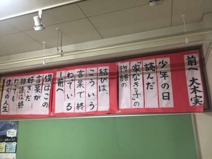 書道部の作品です。図書室前に掲示されています。希望を持って常に「前へ」。どんなにつらくても「前へ」進んでいこう。なかなかいい詩を選びましたね。