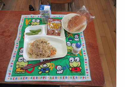 今日のメニューは、焼きそば・枝まめ・パン・サツマイモチップス、牛乳・ドリンクです。