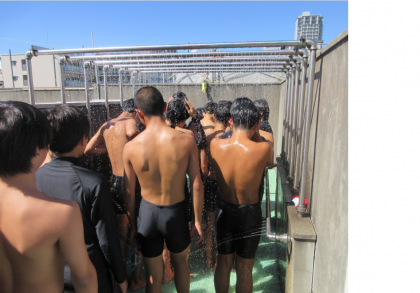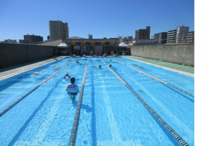 水泳の授業です。平泳ぎの実技テストに向けて、泳法のポイントを再確認しながら泳いでいるようです。