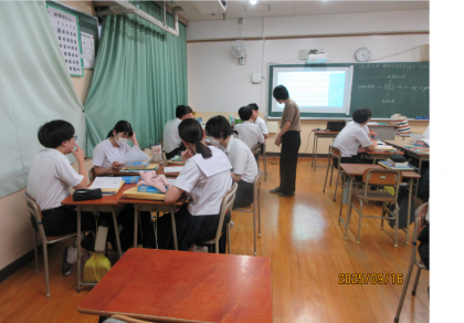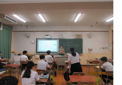 現在分詞(動詞+ing形)を用いて、クラスメイトを紹介する表現を反復練習している様子です。