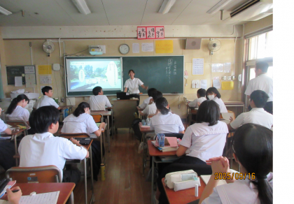 平家物語「敦盛の最期」が本時の教材です。一の谷の古戦場の写真に二人の人物を投影し、平敦盛と熊谷次郎直実の会話を現代語訳で示し、生徒の内容理解を助けています。