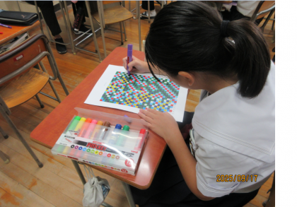 モザイクアート作成中です。色塗り作業も佳境に入ってきました。別室では、各クラス代表生徒が一堂に会し、塗り終えた紙と紙をつなぐ作業のポイントについて説明を受けています。全ての紙をつなぎ合わせると、どんなモザイクアートが浮かび上がるのでしょうか? 楽しみですね!!