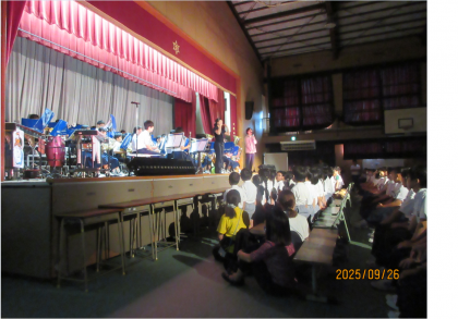 舞台の部トップバッターは吹奏楽部です。味原幼稚園・真田山幼稚園の園児の皆さんも、飛び入りで「さんぽ」を歌ってくださいました。