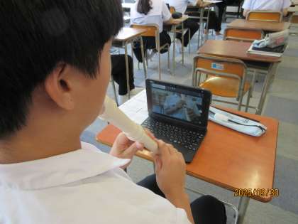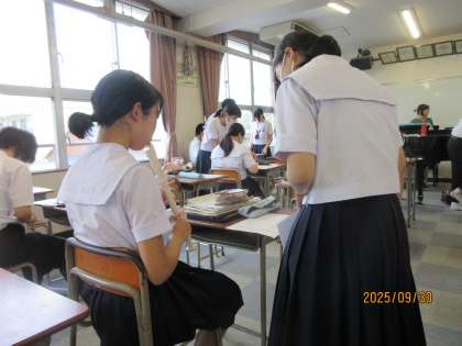 リコーダーの実技テストです。既に合格した生徒が、これからテストに臨む生徒に助言を送ります。テストは、担当教員の面前で実施する方法、もしくは学習者用端末に収めた動画を提出する方法のいずれかを選び実施します。全員合格が最終目標です。