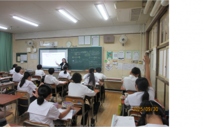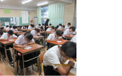 授業の始まりは6分間の小テスト。今日の関数の単元です。関数の定義をおさらいした後、変域の表し方について学習しました。「より大きい」「より小さい(未満)」「以上」「以下」などの表現に留意しながら、不等号(≦、<)を用いて変域を表すとともに、変域中の最小値・最大値を〇もしくは●を用いて数直線上に示し、二つの点を結んで変域を表す方法を問題演習を通して習得しました。